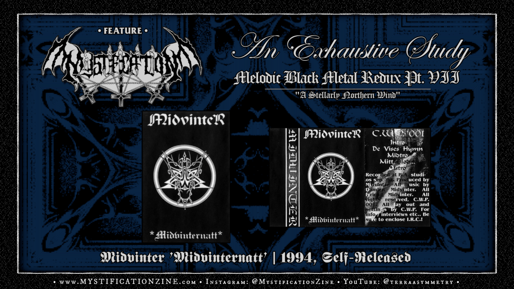 This very brief ~9 minute demo tape was recorded at B.A. Studios in September 1994. Karlskrona, Sweden based trio Midvinter was the vision of one Damien Midvinter (aka Mikael Andersson) who’d formed the band in 1993 enlisting original vocalist Vlad Morbius and drummer Krille (Melek Taus) who’d also featured in another related project Apollgon (a black/death metal band) which they’d developed more-or-less in tandem. The separation between their death metal and black metal projects were not only pronounced but impressive in their early development but this isn’t necessarily the recording that’d made Midvinter a somewhat curious, potentially ambitious name in Swedish melodic black metal. We’ll have to wait until 1997 to get to the heart of that interest. Here we find relatively well composed albeit cursory guitar work with some strong feeling behind its composition with the keys-girded choruses of “De vises hymn” acting as the major point of promise on this tape, the greater shape of this song speaks to lessons learned from melodic death metal as I hear it but ‘Midvinternaat‘ always stood out more for its interstitial sound collages which seem to depict a beast trudging to its dungeon, the screams of torture within said cavern, and a bombastic march unto the end where a village is burned … something like that, there is a bit of horrified cinema in the way the experience is framed and I’d always wanted more of that on the LP.