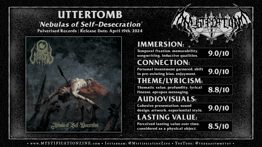 “Seraphobia” acts as the putrid descent, defenestration of the angelic body from a high place as we reach ~2:41 minutes into the song before taking a step back for a moment and returning with one of the coldest, most sinister grooves on the full listen. This paired with the slow-built and droning nearly nine minute closer/title track (“Nebulas of Self-Desecration”) continues to entertain, introduces more vigorous pacing and helps to avoid a full-bore death/doom metal tag from my point of view. Not every moment on the final song is a cunning strike but Uttertomb‘s composer(s) do change it up often enough during this extended closer that it shapes into an imposing, dismal collapse to end the thought.