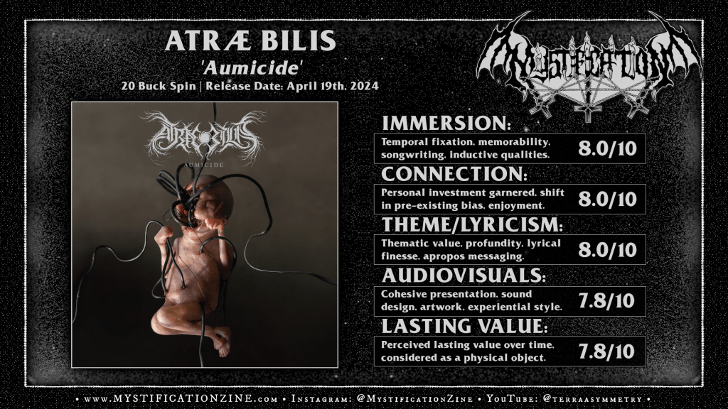 Vancouver, B.C.-based technical death metal quartet ATRÆ BILIS return for a second full-length album and they’ve gone ham on their sound for this one, whipping an incredible amount of detail up in order to deliver an aggro-psychedelic tech-death record driven by insane, mutant grooves. Their style reminds me of the high point of (at the time) tech-death propulsion and groove present by ‘The Negation‘-era of Decapitated but with inspiration taken from peak Canadian tech-death otherwise. They’d already achieved nearly as much with their debut LP though this one stands out for the amount of unexpected and unheard-of sounds they pack into each song, not unlike more recent Afterbirth releases albeit from an entirely different point of view. A trip and a half and an experience which comes with more than a few spectacularly entertaining moments, though I didn’t have anything new to say about their gig beyond the high praise I’d given their debut.