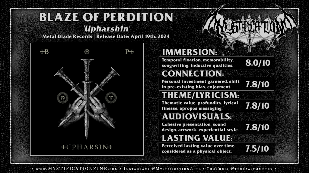 Though they’d clearly been inspired by both “orthodox” Swedish and French black metal of the early-to-mid 2000’s on their first two or three albums Lublin, Poland-based black metal act BLAZE OF PERDITION had sourced an incredible feat from many different angles on ‘Conscious Darkness‘ (2017) the first record of theirs which I’d taken seriously and an expectation set for what’d happen next as they signed with Metal Blade and appeared to be hitting a universally impressive current. Their interest in gothic rock/darkwave was expressed heartily on their 2020 follow-up and it was probably too atmospheric and nuanced a record to be greeted warmly by the underground constituency, or, anyone seeking vitalized aggression… but it wasn’t an outright bad record from my point of view. It might make sense that ‘Upharsin‘ is completely different, arguably a step back into the skin partially shed by ‘The Harrowing of Hearts‘ as they appear to pick up closer to where they’d left off prior to that release without crossing-out some of those same inspirations for subject and pacing.