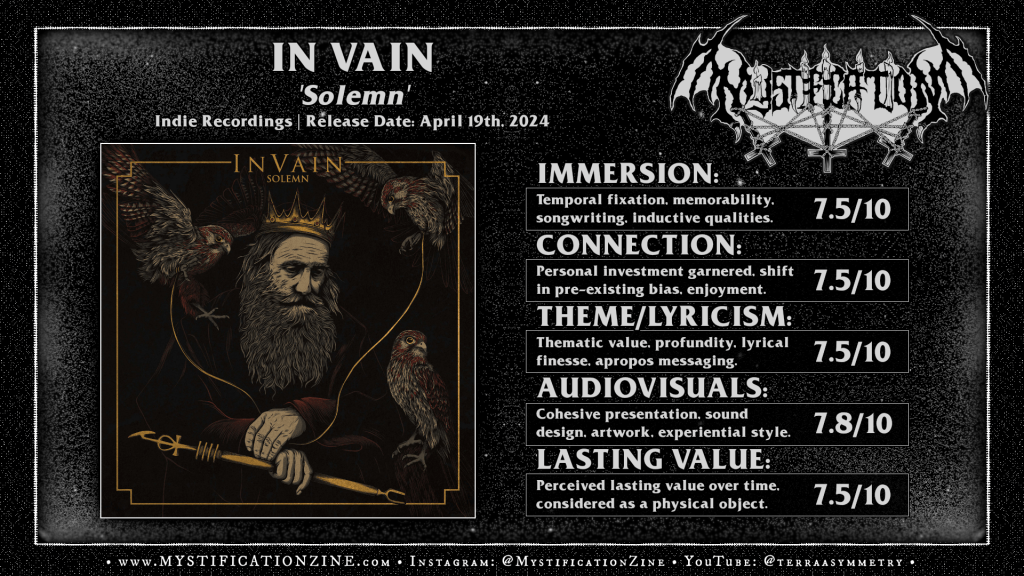 Kristiansand, Norway-based sextet IN VAIN are a progressive death metal band who have developed an accessible style of modern melodic metal over the years which is inspired by groups like Borknagar (“To the Gallows”, “At the Going Down of the Sun”) but also has a dark metal and blackened death metal side to it which veers between October Tide type mourn and the occasional shade of classic Opeth, at least from my point of view. Of course the heavier side of their work interests me more and this time around they’ve done well to trip between those rasping, harshened moments and their cleaner modern prog metal side to the point of balancing out the overdone “Wacken radio metal” feeling I get from a lot of their work. Glossy production values and busied compositions are much improved here compared to ‘Currents‘ back in 2018 but they do end up striking me as strangely mainstream’d alt-metal in spirit, particularly certain vocal melodies here and there which take me out of the intensity of their work. Above-average and extremely pro stuff, though not necessarily to my own taste.