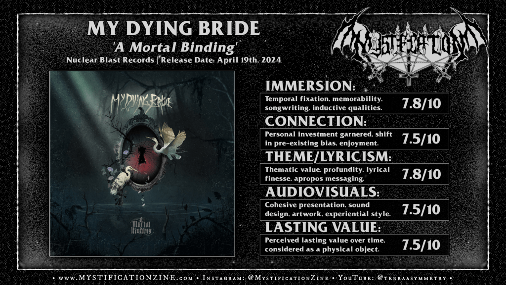 British gothic doom metal pioneers MY DYING BRIDE enter their 34th year with a fifteenth full-length album comprised of songs largely taken from pandemic era writ music. Most of their work on ‘A Mortal Binding‘ aims to emphasize the dramatic romanticist style the band are known for, pivoting from the severe gravity of ‘The Ghost of Orion‘ toward the esoteric and at times challenging-in-pace spectrum of their work which naturally retains a song oriented series of singularly set spectacle in theatric reveal. That is to say that the patient dramatism of the band is at its thickest performative mode herein and this is a bit difficult to resolve after the dire, more emotionally driven peaks of the previous album give way to a solid enough gothic metal inspired release. While I wouldn’t second-guess the sincerity of their focus I didn’t find myself connecting with the overall drift of the running order, such as the choice to bury “The Apocalyptist” yet lead with the in the thick of it aggression of “Her Dominion”. Much as I do understand the practicality of each placement this leaves the action up front and longer maudlin gloomers for the end of Side B and this’d felt counter-intuitive from my point of view as a longtime fan. Not a serious gripe but this one felt a bit off to start and I’d never fully sunk into its wiles.