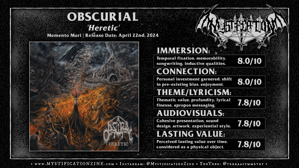 Kuala Lumpur, Malaysia-based ‘old school’ death metal inspired quintet OBSCURIAL return for a second full-length album and generally improve upon the style introduced by their 2021 debut, leaning into dramatic guitar swells and well-enriched production values for a surprisingly memorable spin. As we hit opener “Blasphemous Cult” and “Maggot Incubation” the atmospheric reach of the album quickly reveals itself as still driven by an almost ‘Sothis‘ level of aggression but reaching for a Grave-level attack, supplementing this with odd details such as the vocal effects on “Locust Plague”, otherworldly dive-bombed leads, surreal (and kinda subtle) keyboards, and a crunchier guitar tone which has that snapping cut to it a la earlier Invocator. Though I could reference plenty of old records for smaller aspects of their sound the overall effect doesn’t feel like it is desperate to sound ancient but rather obscure in its distinction and it should only take a few songs to start to soak up this ancient minded yet distinctly nowadays conception. ‘Heretic‘ has more depth than a cursory spin will reveal and there’ll be no reward for rushing through its wares without taking stock of all that they’ve put into each song here, this is especially true as you hit the second half of the album where the real density hits between the dread of “Carrion Disease” and the chunking epic “A Cure For Sickness” which hits this weirdly danceable-death node near the end.