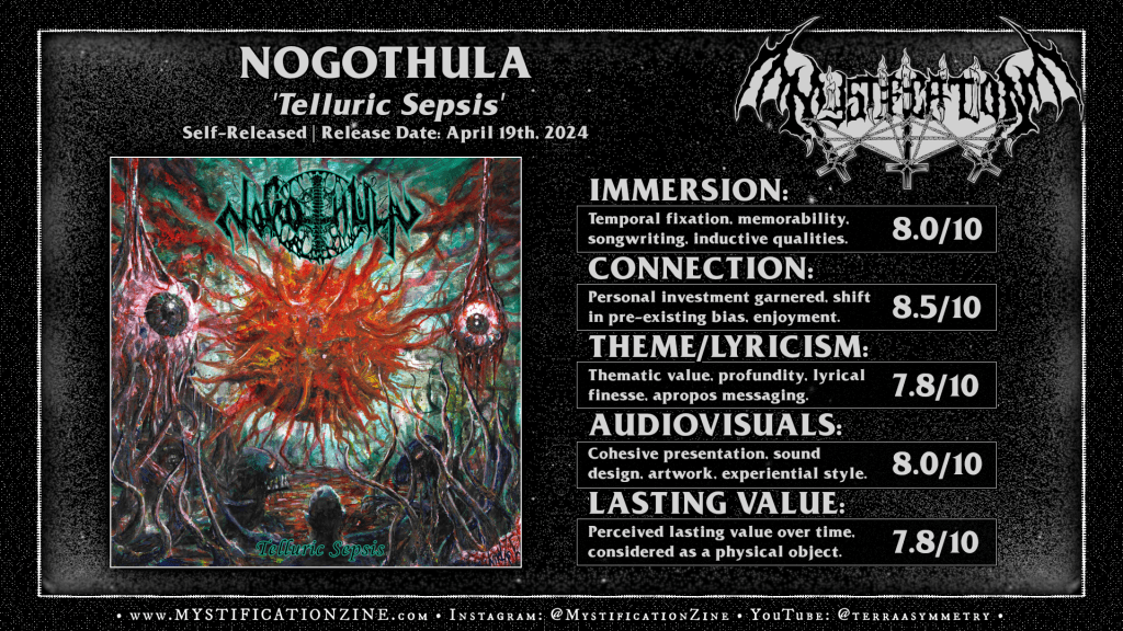 From my point of view the sound and style of Nogothula‘s efforts do not read as entirely unheard of as a fan of blackened death metal but this release does feel inspired in the sense that it spanks it rhythms with a furor first and foremost as music which has a certain classicist appeal while still messing around with less dated idealization of how a death metal record could be “blackened”. They could take this ideal further and I’d found that idea about as invigorating as this album was on its own. Likewise I’d great appreciated how confidently stated ‘Telluric Sepsis‘ was, not at all forced in its delivery and just knotted enough in its compositions to remain interesting after numerous spins. Perfectly fitting production values, slick and tensile sounds which are organic in their final pass but still unreal without presenting as artificial in any sense is a great accomplishment via Noah Buchanan (Mercinary Studios) and the surreal blood-balled horror of the cover art (per Niklas Webjörn Weird Art) likewise represents the sensation of the album well in its harried strokes and intentionally horrified sense of self. The whole package adds up here as the band do well to represent themselves as they’ve quickly proven beyond capable and well above average within this first effort. All that I need now for full ascension as a listener is a few more memorable pieces and a good enough reason to read the lyrics. A high recommendation.