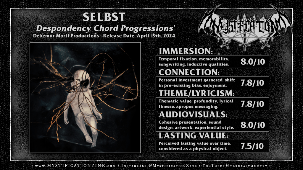The restlessness of Side A loses its momentum around this point and the remaining three pieces manage a cumulative statement (“The One Who Blackens Everything”) a questionable melodic metal ballad (“Between Seclusion and Obsession”) and thankfully at least one more harder-bruising piece to yank us back down to their signature melodious yet dissonant furor after an extended detour out of their old skin; Throughout the course of listening and relistening to ‘Despondency Chord Progressions‘ I’d had two trains of thought worth following, the first being some admiration for how boldly they’d stride into the unknown and manage a healthy dip into the modern dark metallic and post-metal realm without fully dissociating from any recognizable sense of their former self. The second was that this release feels like a different band entirely beyond its opening and closing moments, that perhaps ‘Relatos de Angustia‘ wasn’t enough of an intermediary step between then-and-now for Selbst. In the spirit of the album’s themes the torment held between these ideas, the pros and cons existing together in unsettled strands, feels about right. Not every moment impresses, a few choices grate, and some of the dark magick of the band’s aggressive side has been set aside for now but this’d been in the cards since 2017 and should not wholly alienate folks enchanted by their body of work thus far. The album itself won’t necessarily last on my shelf but I’ll still continue to follow thier work, needing to know what happens next beyond this successfully dramatic stab into the unknown. A moderately high recommendation.