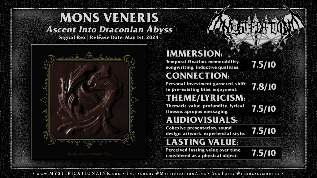 Portuguese artist MONS VENERIS deliver another exceptional out-of-hand and unexpected release in an uninterrupted string of evolutionary output, this time around they’re approaching the altar with weirding experimental black metal. Now active under this name for just over twenty years and only more recently stretching the boundaries of the raw black metal they’d advanced with for the first fifteen or so, this record finds the band reaching for an avant-garde voice and kicking off the first ~half of the record with a 21+ minute song and a set of three songs which echo the off-color chord choices and mangled rhythms that song deploys. I’d first caught wind of this band’s work with their untitled 2021 EP and have followed each release since then, finding this one the most complete thought so far and a worthy experimental sound.