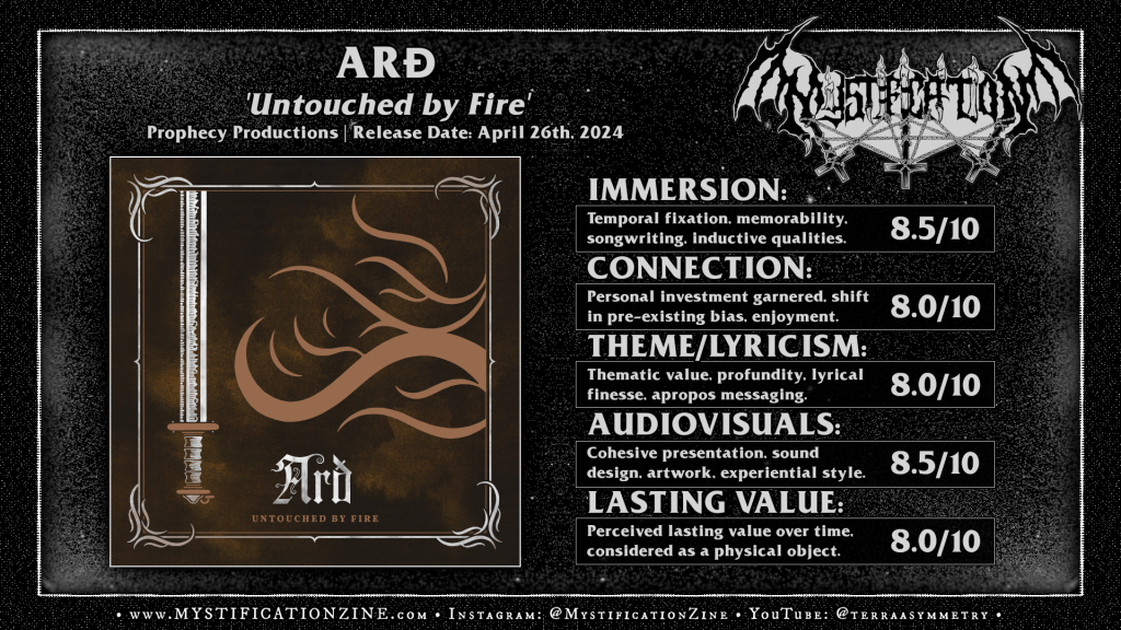 For their sophomore full-length album Newcastle Upon Tyne, England-based melodic doom metal project ARÐ return for another tome of Northumbrian sainted lore, having more precisely secured their narrative voice in creation of music which represents place as its point of purpose. Honing in on the hymnal qualities of their sound for the sake of a songbook writ in biographical context of Christendom’s taming of the land, their efforts trade a loss of earthly grit for the sake of a boon in surety of self and a naturally cathedralesque presence. Fixated upon the life and accomplishments of a benevolent Anglo-Saxon warrior king who’d united and defined the region of Northumbria, ‘Untouched by Fire‘ is not a tale of a conqueror so much as an intercessor, an important figure in establishing cultural bounds to north English identity and an ambitious young unifier acting in purported good faith ’til the point of posthumous sainthood. The self-governed task of biographical relay calls for consistent tonality in this case and as such we do not leave the temporal realm of performance for the duration, set in the pews of their auld cathedral taking in the resonance of this tale in one solid ~forty minute sitting. In this sense we begin to experience a shift from the theatre of melodramatic doom’s atmospheric extremes toward a unique sense of doomed melodicism (and rhythm) in application of devotional storytelling methods.