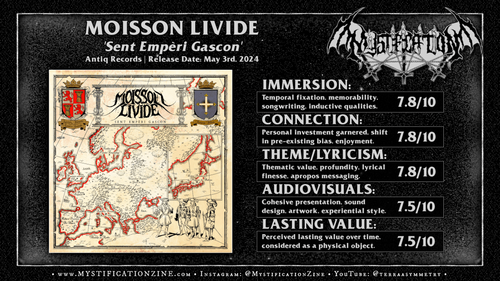 MOISSON LIVIDE is a side-project from Baptise Labenne who is best known for his work in folk metal band Boisson Divine which explores the relationship of melodic black/folk metal aesthetics and the kicking rhythms, leads, and vocal harmonies of heavy/power metal on this debut full-length album. ‘Sent Empèri Gascon‘ is of course most interesting for its exuberant, tuneful style up front as its eight minute opener will quickly attest but there is some additional unique character to their work here which starts with the use of the Gascon dialect, a regional version of the Occitan dialect of French, which gives the album its own sense of place and personage. It is true hybrid release which takes inspiration from other regional groups and labelmates (such as: Véhémence, Aorlhac, etc.) for a medieval vision of blackened melodic power metal which uses folk instrumentation from the artists region to cross various auld melodies with sometimes superficial treatment of metal sub-genre fusion. There is yet a bit of a kitchen sink feeling to their sometimes rudimentary treatments of heavy/power metal movements making for a quirked, off-kilter listen which is yet easy to pick up and enjoy for its strange over the top character. The personality available to this work is its strongest suit, otherwise I’d found it a mixed bag with a few belligerent moments on the way through.