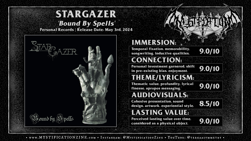 Australian avant-garde blackened death metal legends STARGAZER have treated us to a wealth of arcane prog-death muse since reconfiguring their trio ~2019 and we can now stack on this latest ~20 minute three song mLP (or in this case, the official CD release) onto the altar. Returning to the studio two years beyond the sessions for their 2021 released fourth LP ‘Psychic Secretions‘ these songs ease on the bass lead fusion of said album slightly as they focus on thrashing-loose aggression similar to that of ‘A Merging With the Boundless‘ (2014) on these three pieces which serve their legacy well with auld touches and extra-sentient compositional features. Ornate yet menacing and masterful within their own brand of rhythmic finesse this is of course one of my all-time favorite bands who’ve been entirely consistent throughout their decades long run of quality-over-quantity discography. The vinyl and cassette versions of this EP released early last year via Nuclear War Now! Productions.