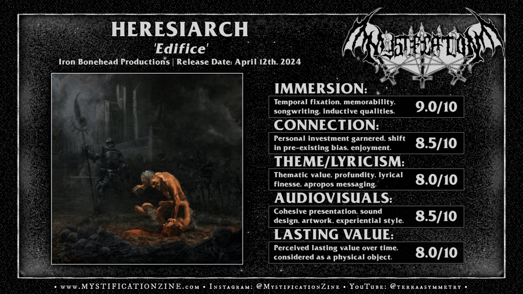 “The primal aggression of an endtime siege and the doomed despondency resultant are captured here on the long anticipated sophomore full-length album from Wellington, New Zealand based bestial blackened death metal quartet HERESIARCH who return with newly tragedian extermination orders seven years beyond their last excursion. ‘Edifice‘ offers a potent leap and unforeseeable change which blurs the lines of war-metallic volatility into new realms of death and doomed decay, crafting battlefield and bloody aftermath alike within each of the ten scenes depicted herein. Commendable as this evolution is in its broader dynamic effect the harried-and-horrified mastery available to these pieces speaks to an inimitable fortitude, a confidence in the seat of command rather than the blindly strewn fare of an experimental leadership.“