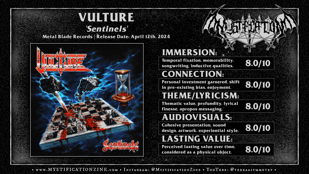 “Dortmund, Germany-based speed metal quintet VULTURE were quick to rise in the realm of throwback early-to-mid 80’s styled craft for the sake of taking their frozen in time style seriously beyond the usual cursory study of the past. In direct contrast to the slower, easier pacing of their previous album ‘Sentinels‘ feels like a well worn in pair of jeans, an expansion of where they’d caught fire and all it’d taken was a few more wailing and riffing pieces to keep the energy up, most of them blazing by at a kicking clip. That said, some of the best songs on this new album take their time and amp up the 80’s metal dramatism (“Der Tod Trägt Schwarzes Leder”, for example) and this only leads to a better rounded, even more traditional feeling stretch of retro speed metal flexing. I particularly love how over the top vocalist L. Steeler is on this album as it really helps to sell the whole deal. Much as I love their debut for the time and place that it’d dropped this is definitely my go-to Vulture record from this point.“