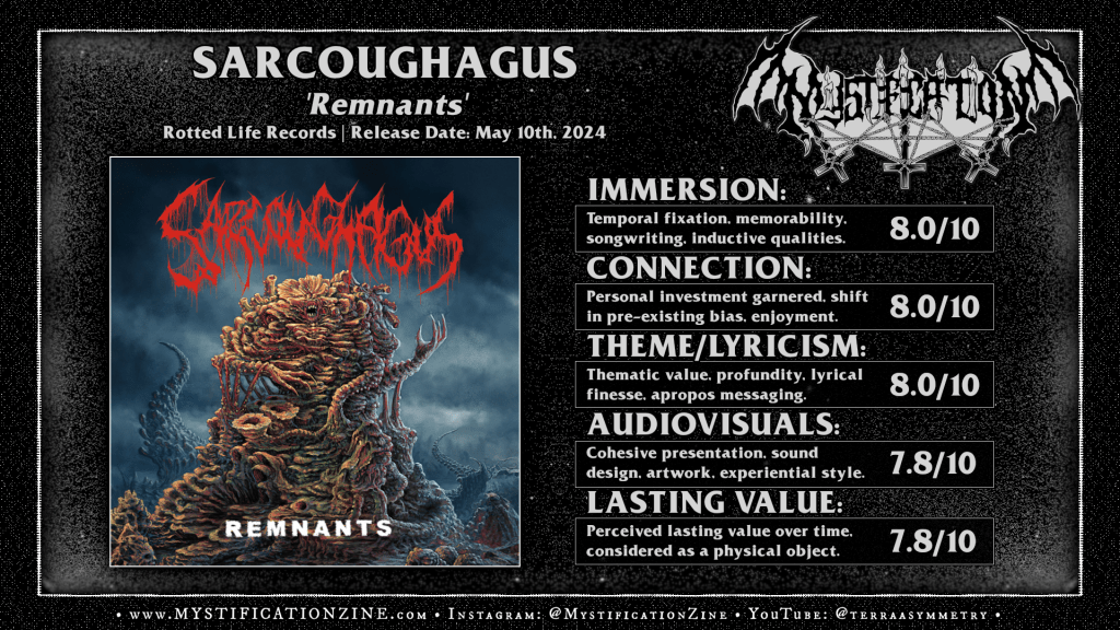 Chipping away at a higher riff-count and feeling their way through properly obsessive pure death metal rhythms Cleveland, Ohio-based death metal band SARCOUGHAGUS pick up the best pieces of themselves as they return to a trio configuration and revise their gig on this latest mLP. As a result ‘Remnants‘ feels like it hits closer to the goal of basal ‘old school’ death metal grooves with a brutal edge than prior releases had while also reworking a couple of songs from their 2021 debut full-length for the sake of contrast. If you aren’t familiar with the band thus far, or weren’t all that impressed by their past work, this one makes a pretty good case for a closer second look.