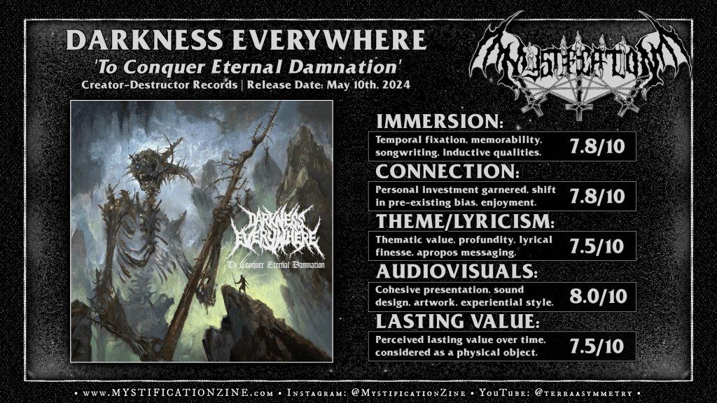 Oakland, California-based melodic death metal quartet DARKNESS EVERYWHERE comes by way of folks best known for their work in Light This City, Crepuscule, and Sarcoptes. Their focus is pretty clearly stated as the vision of vocalist/guitarist Ben Murray taking inspiration from mid-to-late 90’s Swedish melodic death metal and sounding well in tune with ‘The Jester Race‘ in general on this debut. Though these songs are brief they’ve not been phoned in, arriving at their point quickly and not overstating the hook in each case. While a sub-half hour debut LP from a melodeath band in 2024 might seem light on depth I’d felt like their focus was singular enough that anything more might’ve overstated their approach. Much like Astralborne‘s album last year I think it’d be easy to quickly categorize and overlook a record in this style but those who stick around will find more than a few memorable, or, at least heavily repeatable and surprisingly “pure” melodic death metal songs with simple enough appeal.