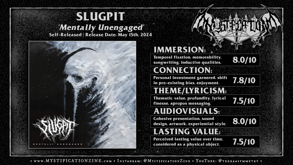 SLUGPIT is a relatively new project based out of Ljubljana, Slovenia which features folks best known for their time in experimental crust band Natt and prog-death thrashers Teleport. Where those two realities meet is an experimental form of blackened death metal infused and grinding hardcore punk, an unreal sound inspired by everything from d-beat and sludge to modern forward-looking bands like Gulch and Artificial Brain. You’re right in assuming that the effect is an everything-bagel of extreme metalpunk but a fully coherent and well-formed sound that makes for a rush of a debut EP to start. They pack a lot into these ~12 minutes with six songs each cutting right to their action which is memorable enough in terms of many stylized twists and turns taken. I guess my continued interest in how they expand this sound depends on how well they can stretch into songs over ~1-2 minutes in length, or, at least hold the rush and groove of their sound together for a doubly long release. Something to look forward to at the very least and I definitely see the potential for this band to catch ears with all that they pack into every moment.