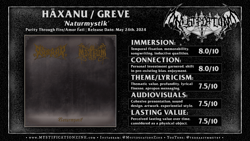 ‘Naturmystik‘ is a split CD between two impressive black metal acts with my preference being for the work of HÄXANU, who made it to the top of my Best of 2023 list with their most recent full-length, though they do not overshadow the always impressive work of Swartadauþuz‘ in GREVE. I’d found the material from Häxanu aimed slightly more atmospheric in its reach per its guitar tone this time around which clashes more readily with the drums to fill the space with a more echoic, thundering sound. This is more-or-less comparable to the band’s sound and approach on their recent split with Collier d’Ombre in early April. Otherwise this is the first we’ve heard from Greve in a couple of years as Swartadauþuz seems to have banked work in Secrets, Balwezo Westijiz, Muvitium and such in the meantime. These songs generally recall the style found on ‘Föllo af svavel, lifvets dimridå‘ which is to say that most all of their material has been fairly similar in that they present glowingly atmospheric “symphonic” black metal though not in the typical late 90’s/2000’s style.
