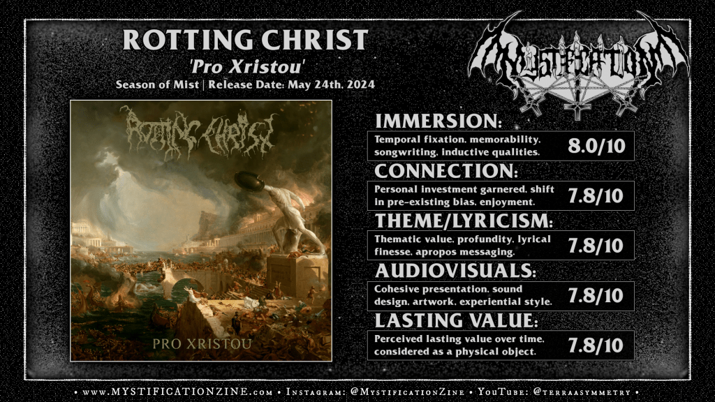 The fourteenth full-length album from Hellenic black metal legends ROTTING CHRIST celebrates their thirty-fifth year beyond their first official release (1989) and themes itself after the era before Christ, referenced as tribute to ancient pagan wisdom and those who fought against the oppression and cultural erasure by the sinister hand of Christendom. Back in 2019 it seemed like this group, or, specifically Sakis Tolis was just enjoying the ride of his legacy and certainly don’t mean that in a negative way but that ‘The Heretics‘ (2019) seemed to be reflecting and relishing in signature above directive in some respect. Pandemic years found the artist releasing a unique solo album or two both under his own name and χ ξ ς’ and those sidebars seem to have inspired the reach and the stature of ‘Pro Xristou‘. Gone are the automated feeling vignettes of the previous album and here songs like “Like Father, Like Son” b/w “The Sixth Day” have that auld 1996-1999 ‘epic’ melodic black/dark metal feeling unique to the artists hand. Depending on your preference within their extensive discography this will just be one blip on the radar as choral arrangements, soaring leads, and slow-thundering pieces (“The Apostate”, “La Lettera del Diavolo”) a la ‘Rituals‘ (2016) also factor into the hourlong dynamic of the full listen.
