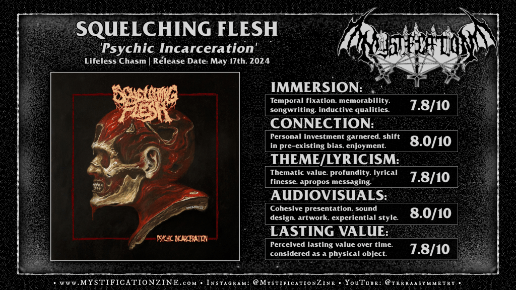 SQUELCHING FLESH is a newer duo featuring two members of Reeking Aura, including Tom Anderer (Grey Skies Fallen) and Terrell Grannum (Thætas), who’ve taken their own creative liberties within this combination of early-days slamming brutal death metal’s cleverly exaggerative, hardcorish grooves and goregrind’s chug-rocking violence. If you can hang with giga belch-toned vocals and the chaos of opener “Old Fingers”, which features a guest spot from Will Smith (Afterbirth), you should find the level of detail pumped into every minute of this EP all the more entertaining once the initial spectacle of their sound has a few minutes to sink in. Granted they crack through these nine songs in ~18 minutes, a blip for brutal death but an opus for a goregrind head, and kinda find their own groove somewhere around the middle with the more swinging press of “Masterminding” b/w “All Day”. Wild-ass stuff overall which finds a way to link classic goregrind and brutality in a way that isn’t predictable, or, at least typical.