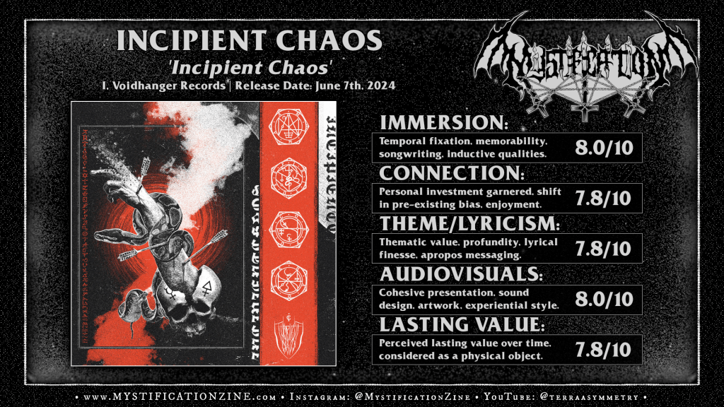 French hermetic black metal band INCIPIENT CHAOS live up to their name here to start, scouring their way through the opener on this self-titled debut full-length album under frantic yet grinding command of their sandblasted attack. That first impression fades quick, though, as ‘Incipient Chaos‘ sprawls in scope beyond that most urgent note and sources a high-level classicist tradition and a ‘modern’ feeling violent sophistication which speaks the right sinister yet militant language right off the bat. This Nantes-based trio’ve been around since 2014 (plus session drummer CsR) and impressed me here from the first song by way of their dual-guitar attack and its ebb between ‘orthodox’ feeling aggression, the strength of the guitar tone, and the endless stream of riffcraft that flows through the first three or so songs at a persistent clip we get a good sense of their overall aim. The thrashing grooves of “The Apex” was more or less what’d gotten me to engage with the full listen and I was happy to see the bass guitar take an active role in the more adventurous turn the song takes in its second half, a first sign that they’d soon expand upon their reach. Though this approach is not unheard-of in terms of French black metal (see: Aosoth, etc.) where the warlike furor of their attack finds somewhere to go within its brutality the substance here comes by way of the violent (but never thoughtless) guitar work for my own taste.