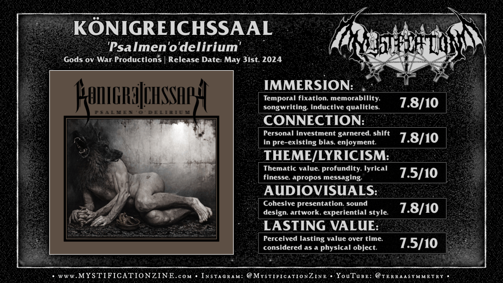 Lewin Brzeski, Poland based trio KÖNIGREICHSSAAL shriek and crawl through the menacing groove which opens this second full-length album and give every hint that there is an imminent eruption on the way as “Iskarja” pops off but when the time comes to explode we get a funereal black drift, a doomed step which takes over the final movement of the piece. “Rubikon” clarifies their intent a but more as a mid-paced, deliriously delivered (eh, something like Urfaust in terms of non-lyrical vocalizations) style of black metal with some interest in modern/post-black dramatism on ‘Psalmen’o’delirium‘. This is primarily entertaining for the emergent, unexpected turns taken within each song which may not be served at a frantic pace but still generally make their mark upon any given piece. The best point of introduction here is probably the extended mid-album burner “Psalmen” for its eclectic reach, its ranting vocals, and representation of the tone of the first half of the album. Though I’m not sure I’d consider this record black-doom metal but there is a tendency toward the tension offered by a plodding, mid-paced delivery and cavernous sound. The full listen appears as a wounded, possessed beast and the atmosphere of the record matches the dramatic yet dungeon-bound tone of their work perfectly. Though some songs definitely had more impact and interest compared to others I will definitely remember the opener and the handful of pieces mentioned here.