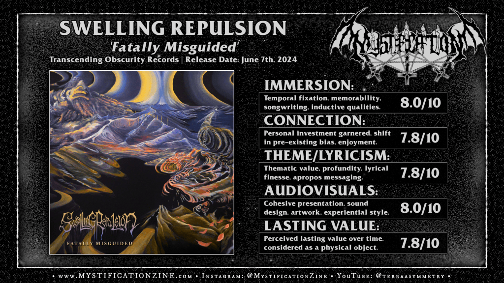 SWELLING REPULSION is a progressive/technical death metal trio with members split between the United States, Australia, and Slovakia and you might recall I’d not only reviewed their debut album (as a duo) ‘The Severed Path‘ back in 2021 but I’d also released it on CD that same year. In the years since they’ve added bassist Kristián Jablonický, put quite a bit more work into their overall render, and still have a unique flair to their gig which I’d always felt had great potential for getting weird with their own brand of brutality. Beyond generally better sorted production values their already tightly wound performances now find heartier structure on ‘Fatally Misguided‘ where flow is still key, repetition helps ideas to sink in better up front and they’ve found a way to incorporate the headier yet dissociative side of their work when called for.
