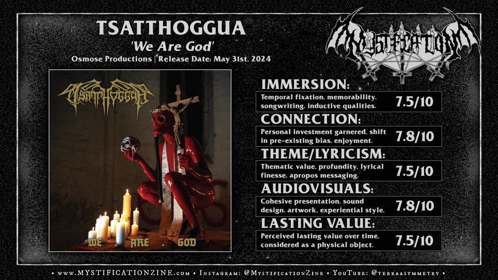 Formed back in 1989 and active ’til a nearly two decade hiatus in the 2000’s where they’d briefly explored symphonic black metal (Ninnghizhidda) German black metal quartet TSATTHOGGUA return here beyond 2019 with an original line-up (sans one guitarist?) and present ‘We Are God‘ as a surprise release here at the end of the month. By way of their associated acts on Osmose back in the day their late 90’s releases have most often been compared to black/thrash metal bands and the early evolution of Impaled Nazarene where some element of grindcore interruptus and use of keyboards made for an interesting, some would say provocateur-minded, but not as infamous impression back in the day. A quick glance at the cover art and sure, they’ve still got a mind for catching the eye with cover artwork but Tsatthoggua aren’t all about show here in the sense that their approach to grinding and thrashing black metal now involves a different level of songcraft, doubling the average length and focusing on what I’d consider a straight forward yet chaotic style of black metal. The declarative verses and melodic push of “The Doom-Scrawl of Taran-Ish” might seem out of place to start but the whole of the song, between its death-grinding turns and the break in the final third all comes together to show they’re not simply picking up from the late 90’s and doing it over. I dunno, you can always tell when a band returns after a long hiatus and no longer listen to metal anymore and in this case these folks still “get” it in terms of ultra-violent attack, whipping out riffs worth a shit, and keeping it mean and/or morbid.
