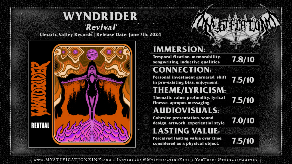 The first impression Johnson City, Tennessee-based stoner/doom metal quartet WYNDRIDER make on this second full-length album is well in line with the blues-driven, simplified groan of mid-80’s United States doom metal and its heavy rock inspired existential drain. Formed in 2022 and already on their sophomore LP no doubt they’ve cranked ’em out easy thus far and you can kinda feel the quick and dirty of it in terms of the chemistry being there and ready to ooze while their greater statement, the larger experience remains indirect and unfussed. Leaving little in the way of memorable energy or experience beyond the opening numbers there is a horrified dissociative side to their work which first sparks up on “Judas” and just a bit later they lose all sensible directive on “Remember the Sabbath”, this’d quickly flatlined my interest in repeated full listens. No doubt ‘Revival‘ is a steady riding album for the most part but there is a lack of energy, a stoned languor that refuses to take the bull by the horns with a big personality. Much as I like the smokey blues driven doom of it all I’m not sure what they were thinking with the ranting verses and tuneless disarray of “The Wheel” (b/w “Judas”) though they are surely conveying a specific theme or feeling which might be more obvious in the lyrics. In this case it wasn’t long before I was jetting to the earlier songs and regularly skipping over a handful of tracks to get to the good stuff.