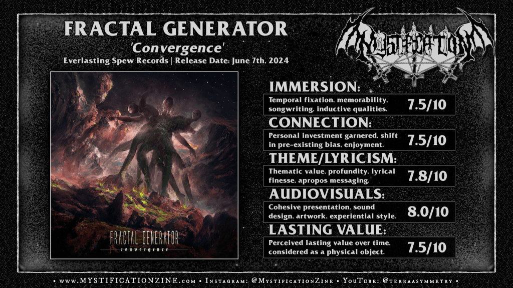 All things considered I don’t think ‘Convergence‘ ever felt like it’d outdone, overshot, or raised any particular ambition beyond what these folks’d achieved on ‘Macrocosmos‘. On one hand we’ve got a consistent follow-up which reinforces and expands the signature elements of the trio’s sound, on the other hand it is an altogether similar experience unless you’re willing to needle at a few details and appreciate the extra accoutrement and atmosphere available to this record. The die-hard brutal and technical death metal fandom are likely best suited for Fractal Generator‘s machine gunned-out density and dramatic (but still contained) treatment of sci-fi themes if only for the sake of how persistent its pacing is. Since I’d appreciated the previous album this once again makes for a compelling enough spin, a weirding but not quite weird enough listening experience per my own taste though it frankly won’t likely be a record I return to often for the sake of it hitting very specific level of pummel and pomp for its duration. If your brain is considerably less calloused by this sort of thing the developing signature of the band may very well present a unique enough path, it is a thrillingly brutal ride-through either way. A moderately high recommendation.