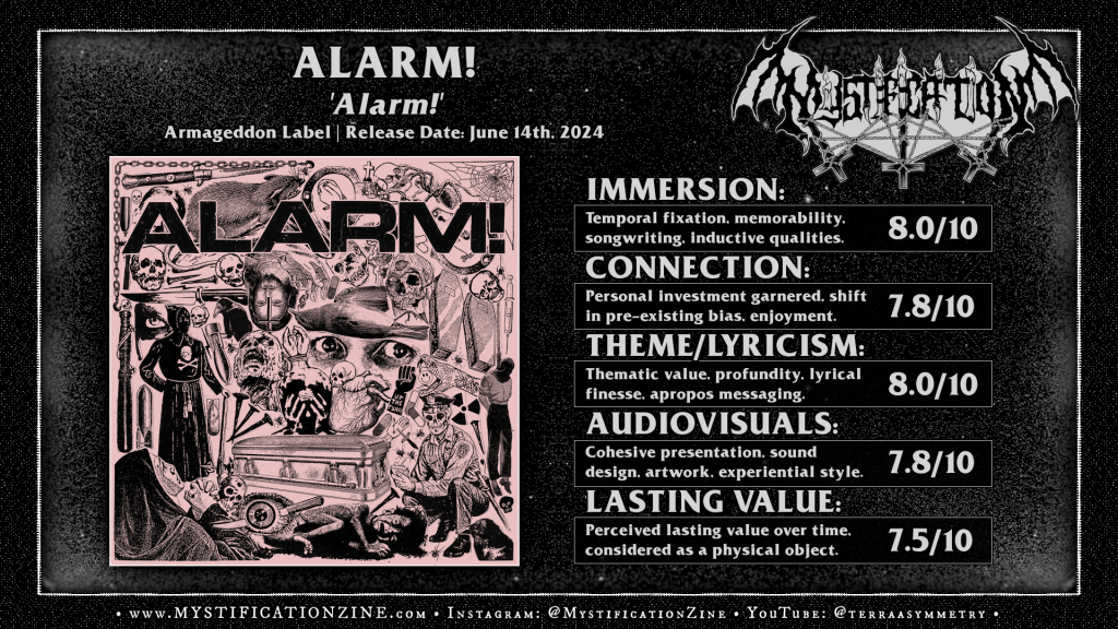 Stockholm, Sweden-based hardcore punk quartet ALARM! arrive as the next big deal from three members of Victims after that band’d gone on hiatus in 2022. In this format, a new entity entirely, there are two big changes noted up front with guitarist Jon Lindqvist now giving us a prime and pronounced performance on bass and they’ve brought in his former Outlast bandmate Henrik Lindqvist on vocals. The spirit of their formative years spent in an era of 90’s hardcore punk comes across here naturally as does some of the melodic crust ideas one’d expect but, to start it was the active role of the bass guitar that’d really had me focusing in on this ~20 minute record. “Ancient Cycles” was the piece to get hung up on, a very different groove they build up toward which recalls the curveballs their previous band would often include in their releases. This one was a great surprise as I’d gone in blind expecting something referential of B’last! based on the album art and ended up with something surprisingly nostalgic, a bit different in its exploration of melody, and altogether on point.