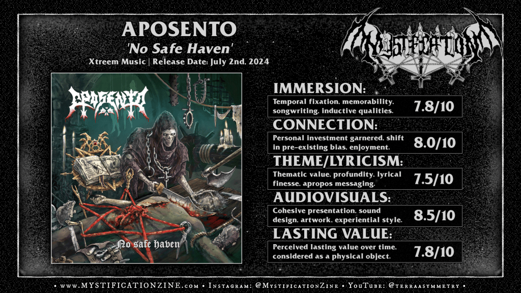 While it is the riffcraft, the referential sound achieved, and the switch to García‘s imposing register which distinguishes ‘No Safe Haven‘ in the grand scheme of things the production values (via engineer Dan Díezare with mixing from Davide Billia) offers a reasonable point of interest here. Of course having the fellowe who drums for Beheaded and Antropofagus tune the mix lends some serious clarity to the drum performances but without sterilizing their resonance in space, there is a classic timbre to these recordings that feels ancient but not obscurant or washed with reverb. As such we get a sound which is less brashly “modern” in that the impact of the rhythm section, not only does this suit the classicist sensibilities of the band but it feels like post-‘Legion‘ released death metal in mid-90’s Poland and Netherlands scenes on some level as we consider the impact of earlier Hate and Altar records, still thrashing crews taking on a more demanding percussive style with clear cues taken from the simple songcraft of early Deicide and the second Sinister record. Of course this record is more accomplished in its musicianship and features a more intense pace in general but we can hone in on a specific 90’s death metal niche where Aposento came from and have always belonged for this record, it feels entirely appropriate and more importantly sounds murderous as they chop through these ten songs in about ~35 minutes.