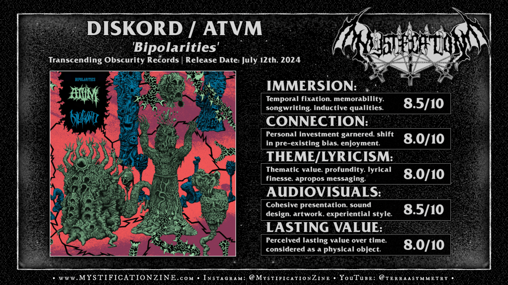 Circuitously strafing trodden paths in delivery of their dual-mode challenge(s) to the well-tested ear this pairing of two remarkable contemporary progressive death metal bands is charmingly apt, a barrage of the idiosyncratic yet brilliantly readable work per distinct troupes, each making spirited work of prog-death forms in the abstract. The time-and-dust tested vision of Norwegian virtuosic aggressors DISKORD and the burgeoning-slow emergence of kaleidoscopic n’ wilding Londoners ATVM in the long form represent a relationship feasibly spread between two poles, each cracking away their own far-reaching extreme yet their work is nonetheless related by similar elemental terra firma and outrageous climes. On ‘Bipolarities‘ symbiosis and distinction are feasible and for the duration of these ~36 minutes we are in a realm of bold strokes, challenging contrasts, and dare I say some of the more original death metal rhythms we’d deign to categorize as canonical in inspiration yet outlier in expression today.