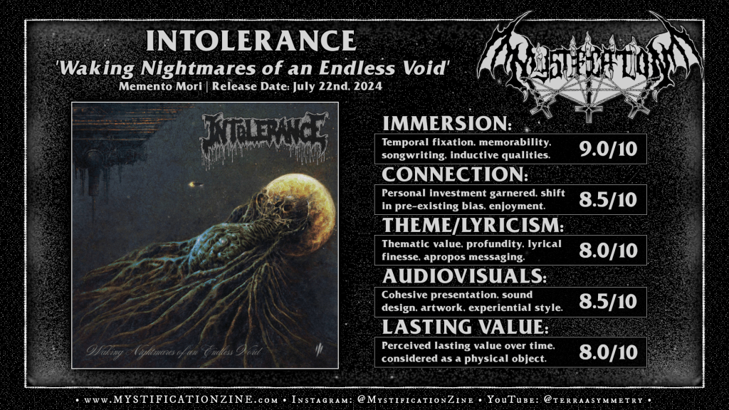 “Spontaneous Self-Awareness of the Void” represents the peaking exhaustion of this record with an early melodic death feeling rise to its introduction and the slow-stepping death/doom current that’d already been rippling through the full listen combining forces for one of the more ‘epic’ movements on the album. This song’d always given me pause when I’d set ‘Waking Nightmares of an Endless Void‘ on intending to test it as background music and finding the jut-out beyond the ~3:26 minute mark consistently caught my interest, feeling the distance covered by Intolerance on this album had been far more than expected. The closer, “Melting Skies”, exacerbates this sensation as they’ve fully weirded out, doomed out into the expanse and brought mournful celestial keys and searching leads as the finale of the album closes on a note of draining horror amidst some manner of darkly howling ascension. The atmosphere at this peaking moment is incredibly intense and goes above and beyond what these folks needed to do to finish the thought.