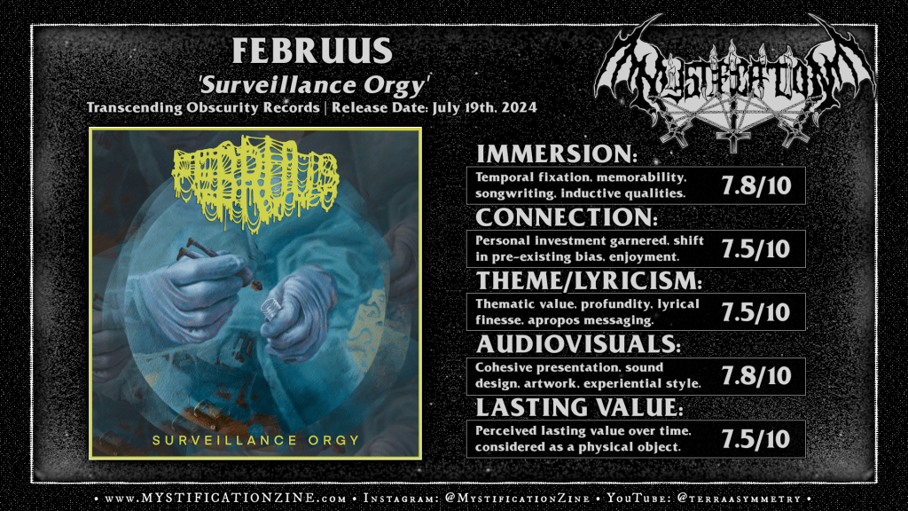 An artist with eclectic taste and some general capability when it comes to approximating style Skåne County, Sweden-based musician Andreas Karlsson has released something like ~fifteen releases (demos, EPs, and albums) split between about five different projects since ~2020. Though his interests range from heavy rock to black and progressive metal FEBRUUS is his avant-garde death metal project and thus far probably the most notable in terms of offering something off-color to typically less-than daring niche. That doesn’t necessarily mean that we’re getting a great record here with ‘Surveillance Orgy‘ but rather that bears a palpably estranged outsider vibe here at the outset with skronking, oddly-set note choices and frequent atmospheric drifts. The best parts of this album step away from the dual rhythm guitar mashing n’ clashing long enough to achieve dissociative states which are by far the knack of the artist rather than the jumble of notes they meld into riffs and oddly-scaling runs throughout. The actual guitar lines are almost universally unpleasant in terms of a death metal listening experience, amounting to a random generation of points often relayed from one causal anchor, but the bigger-picture juxtaposition of disarray and escape conveyed make for an entertaining, nigh paranoid feeling record that is otherwise consistent in building from this modus and… whatever it is that guides it; Most all of these songs pass the eight minute mark in their meandering exploration and in this sense there is some strong immersive value available to folks who appreciate dissonant, avant-garde death metal which makes very few predictable choices with its guitar work. Otherwise I believe the drums are programmed and this rarely works for me when considering how awfully it clashes with the fastidious nature of the performances otherwise. An ambitious record but one that hasn’t quite realized its ambitions just yet.
