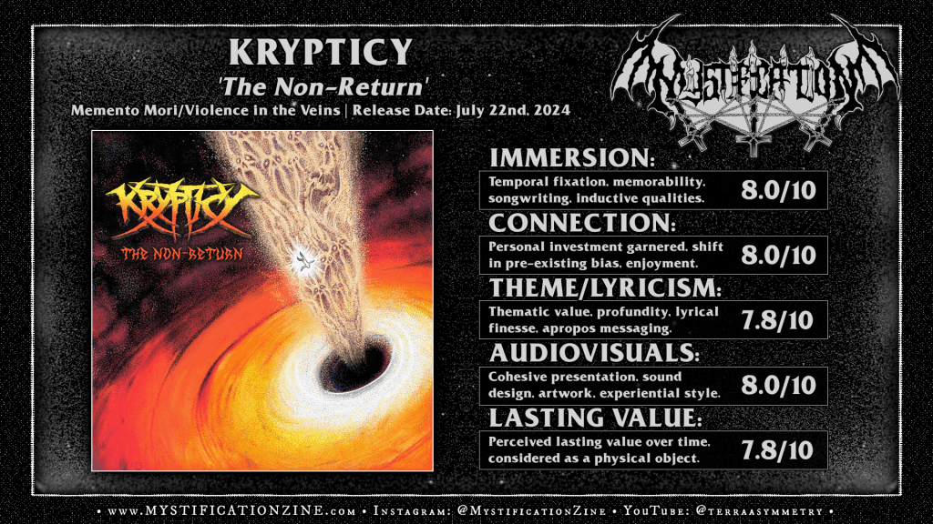 Where do we draw the line in terms of ‘old school’ death metal as the generations continue to stack up and pure imitation has given way to experting fusion of forms? Sticking the 80’s and 90’s probably makes the best sense in terms of drawing a specific line between first, second and such generations beyond… yet we find more and more bands like Málaga, Spain-based death metal quartet KRYPTICY, who’d formed back in the early 2010’s, specializing in early 90’s rooted classicism yet delivering a sensation familiar to the next generation where bands like Krisiun and Diabolic exaggerated elements of Florida death metal as brutal death metal became part of the general vernacular. The best thing about this second LP from the band, ‘The Non-Return‘, is that they continue to veer toward classic sounds though they aren’t afraid to push into more damaging tempos and severe riffcraft. Both the register of the vocalist and the scattered, thrashing rhythms here recall a certain era of mid-to-late 90’s Polish death metal to me (see: Damnation, Mortify etc.) to my ears, otherwise if you are a fan of where bands like Skeletal Remains have taken things on their more recent records but also jive with albums like ‘Apocalyptic Revelation‘ this one should impress. A big improvement upon every aspect of their debut album and their best showing in terms of riffs thus far.