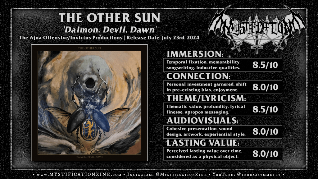 Entranced within their musing upon the contrast offered by life, death and the eternal grasp of the hidden hand the psychedelic/occult rock yesteryears which flow through this second release from Swedish trio THE OTHER SUN are pushed afloat via the extra-spiritually driven mind of author Fredrik Eytzinger who works in collaboration with Icelandic musician Árni Bergur Zoëga (Árstíðir Lífsins, Carpe Noctem, et al.) and the venerable Tommie Eriksson (Saturnalia Temple) in realizing this exceptional, intense display of heavy-lidded revelry and meditative thought. The remnants of 50’s revivalist guitar techniques in late 60’s psychedelic folk form a loose basin for the blood here, though surf guitar (and much more) eventually arrives to flavour-in the heady, blissful hum of ‘Daimon, Devil, Dawn‘. All is new yet old and dark yet wizened by its own inherent intoxication as the first several songs arrive here yet the test, the heart of the album arrives around “Horizon Between the Eyes” where the album asks for patience rather than smoking-in and floating past. For my own taste the ‘less atmospheric’ gusts of this album (“Black as Gold”, “Conjuring Other”) were probably their most thoughtful yet there’ll be no denying the atmospheric richness of this recording felt within pieces like “Pan” and “Lion Spell”. If you are a fan of The Devil’s Blood, Occultation‘s second album, or Sabbath Assembly give this one a serious spin or two.