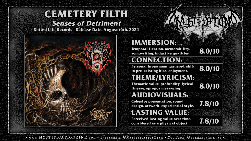 Though this latest EP from Atlanta, Georgia-based death metal trio CEMETERY FILTH comes with a short list of changes made to personnel and a different approach to the mapping of its overall tempos one can still walk into their realm expecting ‘old school’ United States death metal inspired work. ‘Senses of Detriment‘ appears to lead with a differently-specific muse under the same general umbrella now focusing on the earliest shifts towards progressive tendency in death metal without losing the raw, classicist edge the band’ve become known for. Though the referential gait of this album is loudly telegraphed within its rhythms this doesn’t stop their work from being an above-average ride and a compelling slap of the refresh button for their whole gig. Whether it is a side quest or a new direction you can head in expecting a serious, thoughtful stab at classic death metal sounds.