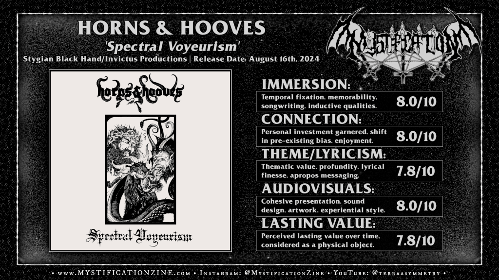 A buttplug cruet filled with the Host, handcuffs that ring like sacred bells, and one particularly… unthinkably crusted-over altar cloth introduce us to the latest good-hurting muse from Brooklyn, New York-based black metal trio HORNS & HOOVES who sling their eye-burning jizz upon the nave via cock-headed aspergillum here on their latest EP release, ‘Spectral Voyeurism‘. Enchanted in their own demesne of prong-lifting gall and rectally bleeding from the unholy experiments at hand these fellowes once again seek to root black metal in an alternate timeline, following the old ways along a different path rather than retread the usual old-meets-new ethos. In the process they’ve birthed a spiritual chimaera, a beast of many backs able to roar in multiple resonances at once, one which still speaks to black metal in fundament but relishes in depraved filth and indulges every chance for the odd psychotic break beyond (or away from) the usual USBM idyll.