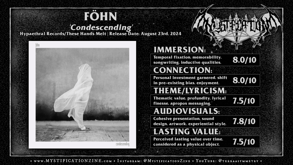 Gnawed from the inside and itching around the edges of every breaking wound this welt-inducing examination of purpose, human nature, and ever-ailing compassion by way of Athens, Greece-based funeral doom metal trio FÖHN finds its breach point at a loss of purpose, offering their resignation to nihil as we step into their realm. Delivered with commendable patience and notable enough conviction ‘Condescending‘ is a considerable ask out the gates as a four-song, hourlong double LP (and a debut release at that) yet any patience given to their work should yield equitable results for the funeral doom attuned sort. Within these four extended meditations they’ve infrequently strayed into the avant-garde spectrum of the sub-genre, tactfully presenting just a few key points of abstraction for the sake of distinction and gilding alike on this above-average first showing.