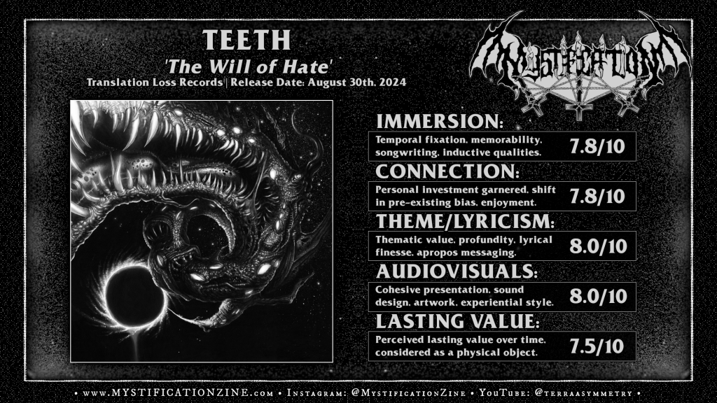 Teeth formed circa 2013 between folks who’d run the gamut of underground interests and emerging trends between death-grind, atmospheric black metal, death-thrash, hardcore and such in the 2000’s and early 2010’s but they’d put this particular band together playing a sludge metal inspired form of death metal, eventually crossing the atmospheric edge of third gen post-metal with abstract/technical death metal influences. Their (initially) self-released debut full-length (‘Unremittance‘, 2014) was their only direct step along the outright sludge n’ grind path beyond a few splits in 2016 as they’d pivoted toward a more technical, sometimes grinding style on their second album (‘The Curse of Entropy‘, 2019) and it was a pretty good album, notable for its attack though most of their work bled together for my own taste upon brief review. The follow-up EP (‘Finite‘, 2021) remedied this with a focus on extremes, pushing for their atmospheric side and juxtaposing it with a more brutal uptick, it’d more-or-less been the main reason I spent some extra time with ‘The Will of Hate‘, curious to see how they’d develop depth beyond the simple effect of that EP.
