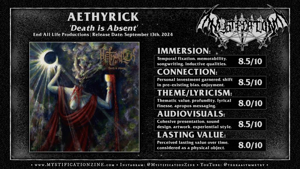 Death does not determine the entire path of the spirit but instead acts as a doorway beyond the flesh, a gatekeeper to transcendence as insisted by Finland-based melodic black metal duo AETHYRICK on this fifth full-length album. Herein they’d portend the authority of the reaper ends upon passage through mortality, denying any further fatalism necessary for those who’ve enough sense to stoke the fires of personal spirituality. ‘Death is Absent‘ has much more to say than this when plumbed for its depth but the initial prompt does well to set the tone for the unearthly sojourn ahead, another escalation of the self they’ve been cultivating for nearly a decade. Neatly generated with a strong melodic hand, a sharp-eyed aesthetic, and an ear for deeply layered atmosphere the bands work continues to reinforce its signature here with some of their best-yet communicated intent while still allowing some room for that sound and spirit to evolve in real time.