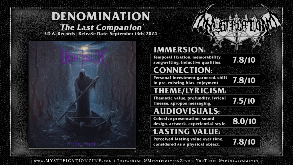 You might think I’d sneer at yet another death metal record buzzing up quick with ye olde Stockholm sound, the overdone Boss HM-2 cranked type of deal, but these Hagen, Germany-based folks are using it in honest homage to the early-to-mid 90’s Swedish death metal sound… at least in the sense that they’re not writing lazy-assed, generic songs which rely on it. Denomination weren’t all that mind-blowing on their debut LP back in 2020 but this time around you can tell they’ve put in some work toward a higher standard both in terms of their aesthetic and more importantly cranking out songs which hit their riffs quick, loom large, or at least chug out a sinister progression or a horrified lead before moving on. They rip through these ~12 songs fast and with just enough variety that some of the death n’ roll type grooves (“Cremation Ground”, “Army of the Rotten”) still work within the greater ride of it all. While I think this record would’ve been more of a thrill-ride if they went for more variety rather than the simpler chargers (re: “The Last Companion”) and leaned into death-doom (“The Beginning of the End”) type pieces more often it’d have broken up their big block of songs int more of an experience. Overall a solid sophomore LP and well above-average work if you’re prone to dig into giga HM-2 powered death metal.