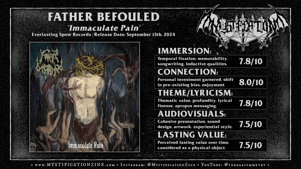 ‘Immaculate Pain‘ is the latest EP release from Atlanta, Georgia-based death metal band FATHER BEFOULED who’ve been around long enough to instill nothing but confidence in their pure and punishing style of United States death metal. This’ll be the first release from the band to feature drummer Chris MacDonald (Ectovoid, Seraphic Entombment) who is of course is a natural addition for their brutal yet doomed sound. This EP features three new original pieces which generally grind through slower, doomed-out atmosphere alongside covers of well-known Morbid Angel and Abhorrence (Finland) songs. The big song here for my own taste is the sauntering zombified step of “Abomination of Flesh” with its pinch harmonic punctuated riffs and the loud, raw sound of the drums which stomps through the whole record. Otherwise some of the more intricate guitar work on “Impertinent Faith” caught my ear more than once. Solid EP in terms of overall style and the songs themselves though not my favorite album art/production sound from their discography thus far.