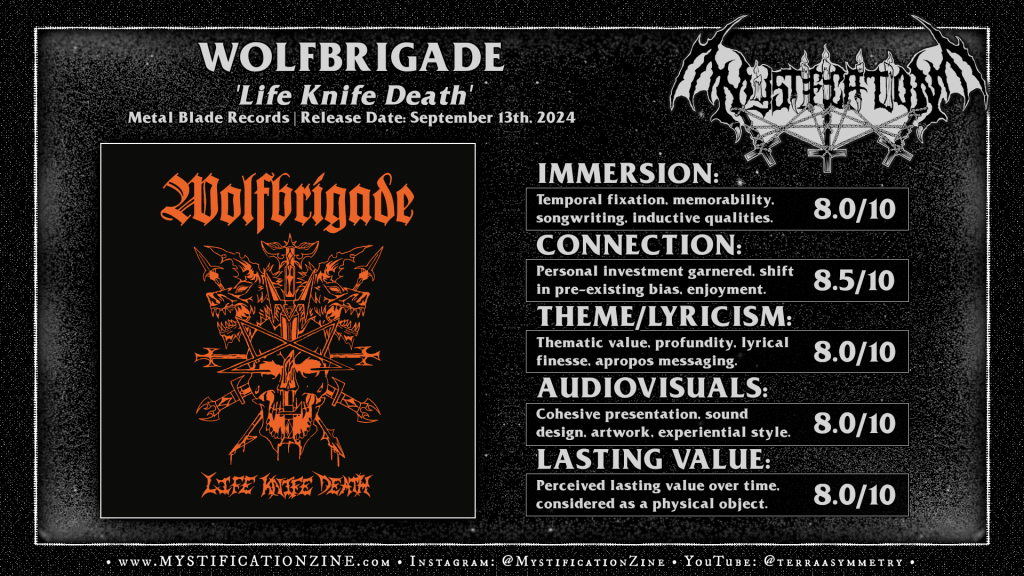 Swedish kängpunk quintet WOLFBRIGADE are a well-known institution today in terms of classic crust punk inspired music that’d broken down many borders to metal and melodicism along the way. Their first incarnation (Wolfpack) as an ex-death metal crew with the fellowe from Anti Cimex on vocals is probably more infamous in the underground mindset anymore but they’ve been made favorites as the popularity of bands like Disfear, Skitsystem and such kicked up in the early 2000’s alongside the band’s eventual inspiration taken from speed metal and death metal along the way. If you’re looking for somewhat original takes, plenty of variety attached to this style of music these folks have managed a style which I’d consider arena-sized Scandinavian crust, still raw and confrontational but also eclectic in a way that separates them from the usual d-beat band hitting the distortion with a death metal guitar pedal. With ‘Life Knife Death‘ being their eleventh album and I believe first for Metal Blade they’ve clearly put some time into each of these short and bruising pieces, making sure their full range is entirely covered within these 12 songs and ~28 minutes. They’re still in touch with some kind of vital energy here despite plenty of mid-paced and semi-melodic pieces hitting along the way, obviously going for a darker atmosphere with that ‘Morbid Tales‘ inspired cover art and all, but without shrouding their attack. Big fan of this style and these folks still have it in terms of putting together an easy to pick up record. Favorite songs: “Nail Bomb”, “Disarm or be Destroyed”, and “Cyanide Messiah”.