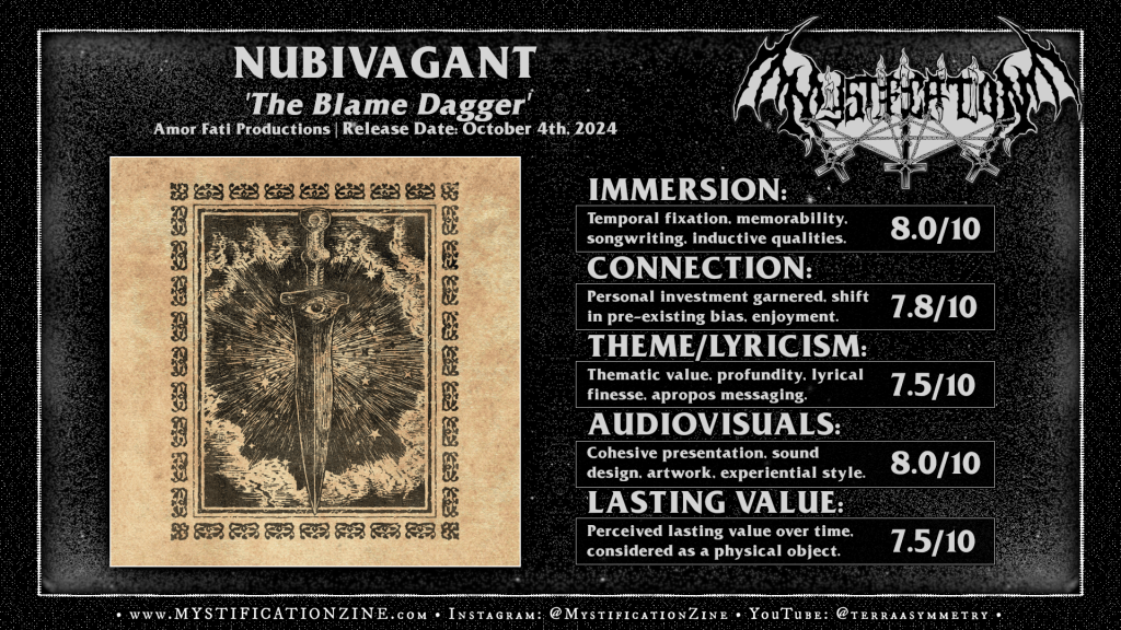 Levitating in the air mid-sacrifice and relishing in the coming blow Italian atmospheric black metal project NUBIVAGANT looms as a despairing spectre overhead in presentation of this third iteration upon what has shaped up to be a unique yet simply executed sound and style. Although ‘The Blame Dagger‘ may yet avoid stepping into actual doom metal territory the dizzying, hypnotic form of clean-sung black metal fusion in hand nonetheless achieves an effective feeling of lucid haunt. Fixated on spiritual conflict and divine judgement this solo venture once again achieves its own personalized fixation without straying from its core conceit, finding a few violent strokes here and there but ultimately extending the greater conversation into a third and equally worthy chapter in their impressive tome.