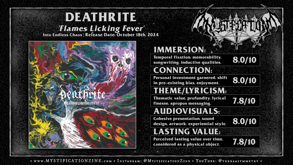 Echoic vocals which snarl, grunt and wail with dread lead Deathrite with disillusioned character, guitar tones are both aggressive and gloom-stricken per their uglier harmonization, bass guitar tones are low-set as an anchor, and drums crash in forward-set space creating the resonant boundaries of the space depicted. Sound design definitely gives reasonable triangular parity between riffs, vocals and drums and appear specially tuned to let their knack for crossover feeling change-ups to have their best-possible impact (a la “Misanthropic Rush”) while still presenting something death metal adjacent in tone. Though production values, aesthetics, and general easy-flowing crossing of sub-genre paths don’t all overtake the songcraft in terms of importance here no doubt ‘Flames Licking Fever‘ is built on an eclectic and neatly attuned audiovisual experience and this is again most notable on pieces like “A Slave to a Poisoned Soul” where they’re just on fire in general.