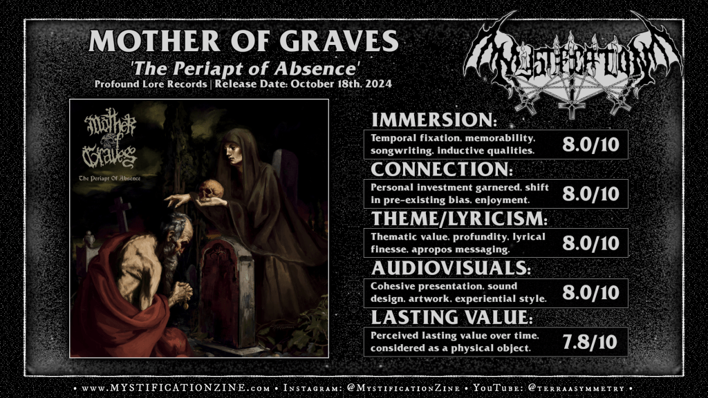 As I’d stepped into the Mother of Graves portal once more and taken a long stare at my surroundings I’d been more thrilled to hear this style melodic death-doom metal done right than anything else. To steep within this largely notable set of songs in this style was a joy but admittedly not a connection with the sorrowful verve found within, at least not on a personal level. The internalized dread and gothic poetry-infused work herein is substantial, memorable, effective in some sense but it did not revive the core depressive within and compel it to dance along outright. To be fair this’d just as well be attributed to becoming increasingly dead inside over the years, unable to access the dysphoric core of my brain on demand, and yet I’d still appreciated the dire yet confrontational feeling of their work per an organic-yet-surreal sound delivered in an authentic, somewhat updated vision of the old ways. By honing in on specific taste and capturing the most brilliant essences of early melodic death-doom ‘The Periapt of Absence‘ remains entertaining, almost too appreciably engaging as their burdensome points of despondency are diarized in rich gothic doom metal tapestry. A high recommendation.