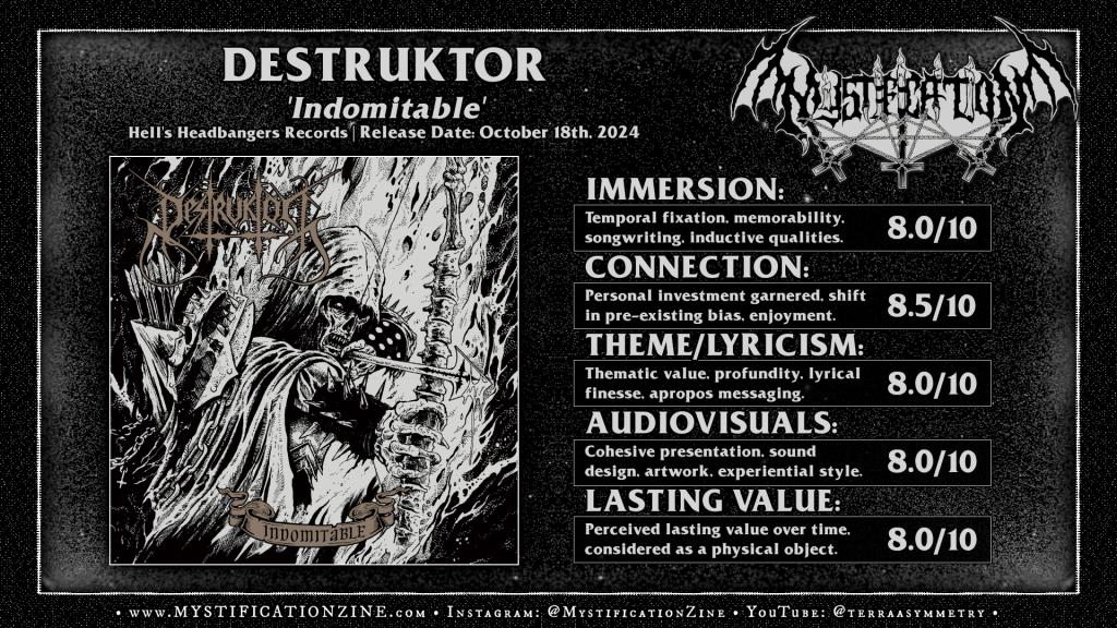 Around since the mid-90’s (originally as a black metal duo named Aphasia) Victoria, Australia-based black/death metal band DESTRUKTOR would officially form as a duo centering around the vision of founding member Glenn Destruktor as a contemporary of the black/thrash and blackened death out of the country at the time which was noted as an elite and raw force that’d originally featured Nocturnal Graves maestro J.R. aka Hellspawn ’til the mid-2000’s or so. All three of their albums, this one included, focus on fastidiously composed riffcraft which is smartly executed at a murderous pace, ‘Indomitable‘ is probably the best they’ve ever sounded and the least they’ve ever obstructed the guitar tones to the point that we get an up close, full HD stab to the face every time these folks cut a riff all of which are militaristic in their aggression but thoughtful in their overall effect. While most of the album is direct to throat, un-fucked with in terms of its classic death metal exaggerated accost there are a few songs where the grooves applied offer a bout of unexpected elasticity with “Beyond the Bleakness” being a fine example. Brilliant blackened death metal record, short and brutal as shit but all-killer throughout.