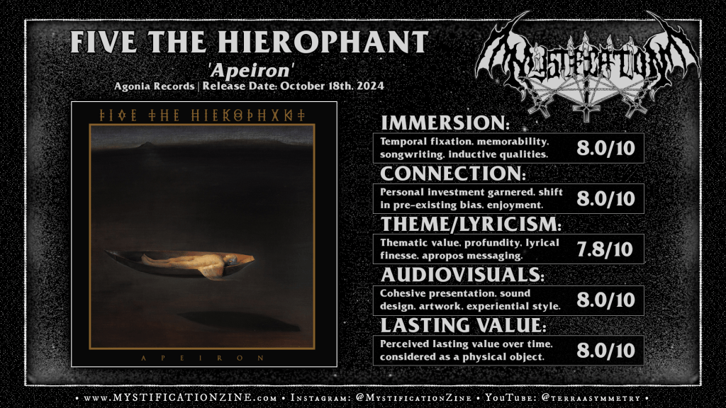 London, England-based avant-garde/post-blackened doom-jazz quartet FIVE THE HIEROPHANT have once again sent me into a days-long trance via their hypnotic instrumental musing upon the dark and infinite, a procession of snaking and doomed riffs conveyed via a directive saxophone (via Jon Roffey) and the vision of Polish artist Kali (Witchmaster, ex-Profanum). The big change here comes with the addition of new bassist Gavin Thomas (Bast) and one less percussionist as far as I can tell. This doesn’t leave the band’s sound sparse in any sense though ‘Apeiron‘ does feel focused, singularly set in its vision as these psychedelic trips occur in slow-slinking steps. To replace a bassist on an album which requires such a solid connection with the bass guitar was certainly a big ask but Thomas does a fantastic job on ‘Apeiron‘, especially when truly called for on songs like “Uroboros”. If you are a fan of the beat-magicked body movement of Oranssi Pazuzu and the black energetic adventure of Aluk Todolo you will more than likely feel this band’s work intensely. I’d personally love to see them live but for now they’re touring Europe for most of this month (October).