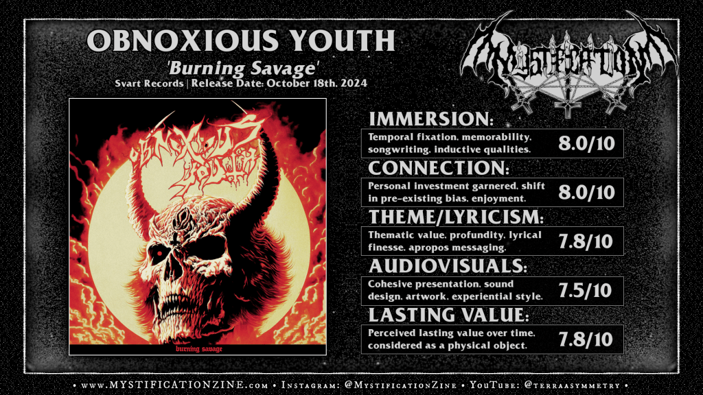 I dunno, from the moment I set eyes upon this latest OBNOXIOUS YOUTH album’s artwork it kept nagging me that it might done by an AI artist, and if it wasn’t [it probably wasn’t] then I don’t get the vagina insignia crammed into the forehead next to the MS Paint inverted cross scribbled below it. A crossing of Swedish and Finnish maligned and mutated folks making hardcore punk incensed heavy/speed metal since the mid-2000’s this band’ve been off their shit for about seven years in terms of full-lengths but we’d gotten a pretty stellar EP from them via the dread-year MMXX and that’d more-or-less set the expectations for this one. This time around we get a full ~40 minute blazon from Obnoxious Youth and they’ve kept it raw, tuneful, erratic and upheld that ripping speed applied to UK82 influenced metal that’d always helped them stand out and sure, most of that being attributed to rowdy-ass guitar work.