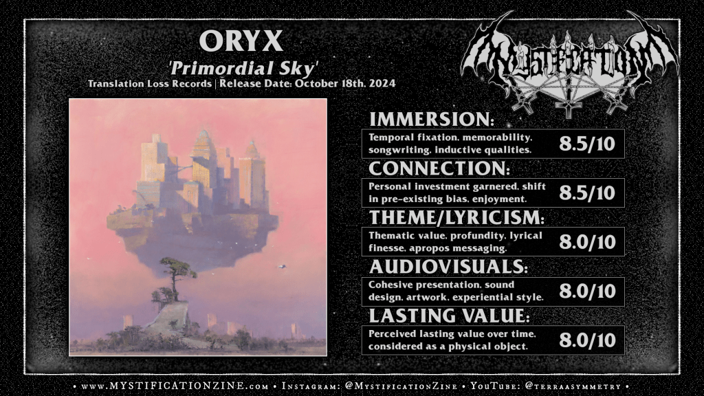 Denver, Colorado-based sludge/doom metal trio ORYX have won me over on sight once more via their choice of cover art, a unique painting from English painter John Harris where the suspended city and the pollution rich air are backdrop to a desert-like landscape. Rasping and lumbering into view steadily ‘Primordial Sky‘ and its title track/opener provides haze and harassment as it appears, a melting mirage out of reach for its first several minutes. I’d appreciated this approach, a slow re-entry into their orbit not only for its ease of introduction but the shimmering and humming values that it’d brought once within firing range. It is a beautiful piece that’d easily won me over via its psychedelic, introspective presence and extremely strong production values, all of which felt a bit more personally attuned than ‘Lamenting a Dead World‘ (2021) though each record makes a brilliant argument for their craft. If you’re in it for the dirt, the plow and howl of extreme sludge you’re still getting that side of the band on this four song, ~40 minute record but moreso within the ‘shorter’ seven minute songs which feature as the innards here. I particularly enjoyed the almost Ufomammut type stoner-psych doom roll of “Myopic” as it’d developed, highlighting the unique interplay between the various freaked-out guitar tones and the foundation of the rhythm section. Things go slightly Godflesh grooved at times but the closer does well to refocus the full listen and thankfully matches the enormous energy of the opener in kind. Fantastic atmospheric sludge metal record, truly expansive and patient in its showcase yet made massive by an abundance of riff and wreckage throughout. If you were big on the latest Fórn and Inter Arma records and enjoy that sort of death metal adjacent vocal roar this’ll be an essential record for the month.