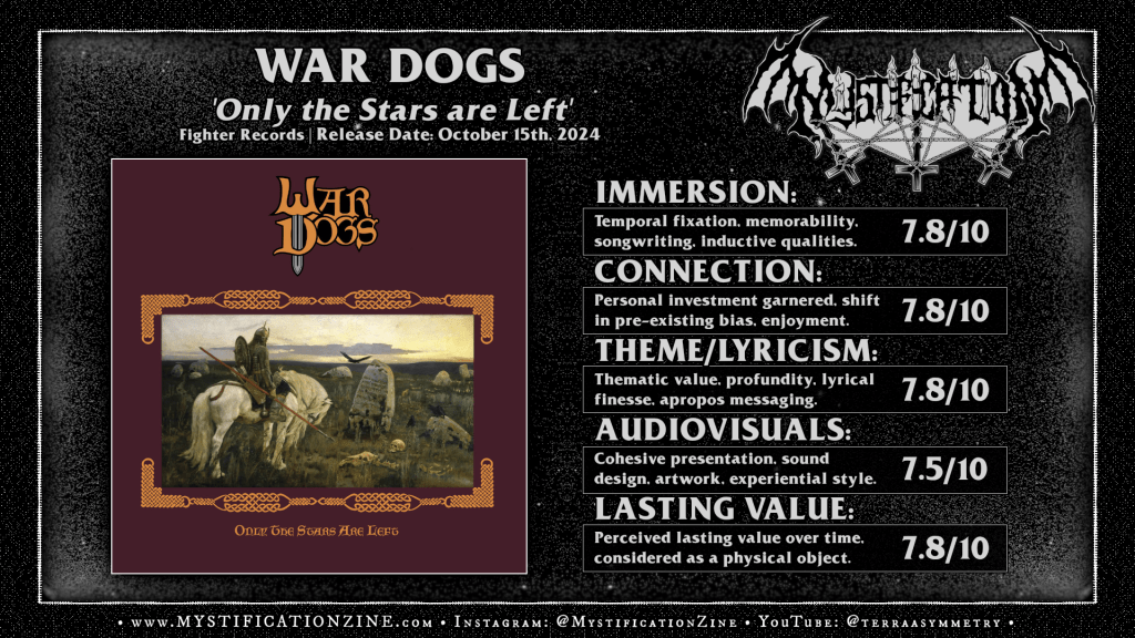 Southeastern Spanish epic heavy/speed metal band WAR DOGS return energized and still fully obsessed with 80’s traditional heavy metal on this second full-length album. ‘Only the Stars are Left’ takes a patient hand to tuneful songcraft, a steady mid-paced and clearly sung ride through ~5-6 minute pieces each of which sidesteps spastic personae for the sake of delivering the song without flair or panache. When I’d given brief review of their first album, likening certain moments to Omen at their least haunted, I’d felt that record was kinda soft in terms of that strange AOR component to throwback NWOTHM today and thankfully this record sticks to a melodic directive but cranks the speed somewhat more often on this follow-up. Fans of everything from Visigoth to Grand Magus should appreciate the straightforward and modestly tuneful approach of this album.